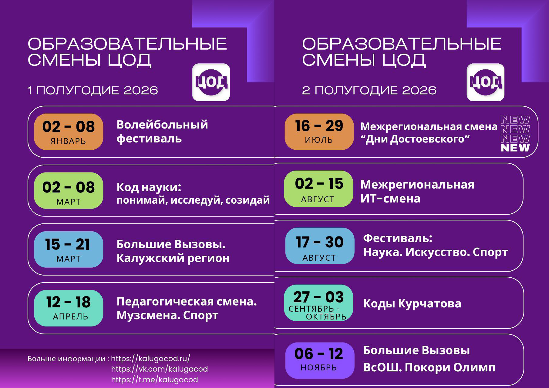 - Поменялись местами тематики двух смен: "Коды Курчатова" перемещаются на сентябрь, а "Код науки: понимай, исследуй, созидай" пройдет в марте!