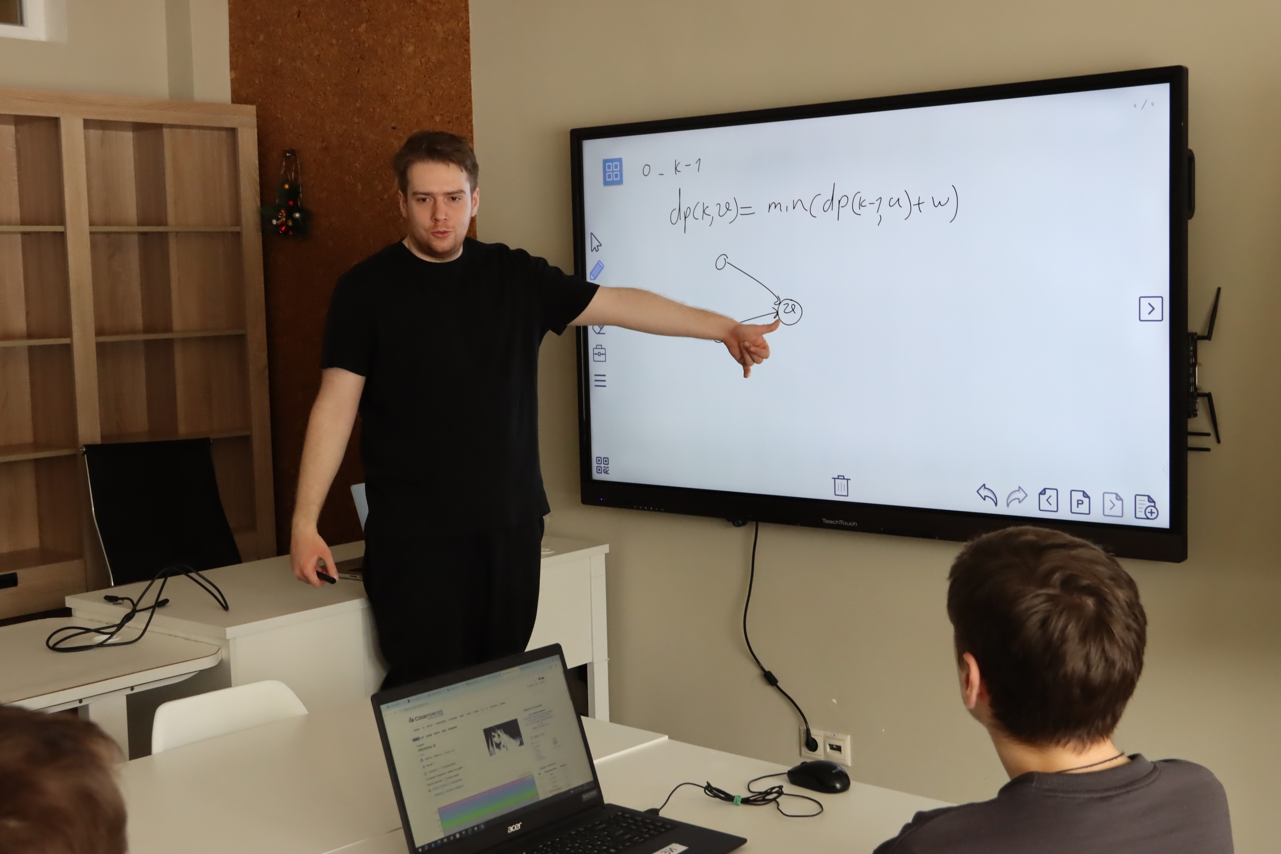 На смене «Код науки» работает направление для тех, кто уже вошёл в олимпиадный мир и готов двигаться дальше. Илья Сергеевич Хожаев ведёт программу, ориентированную на участников Всероссийской олимпиады школьников по направлению «Информатика».