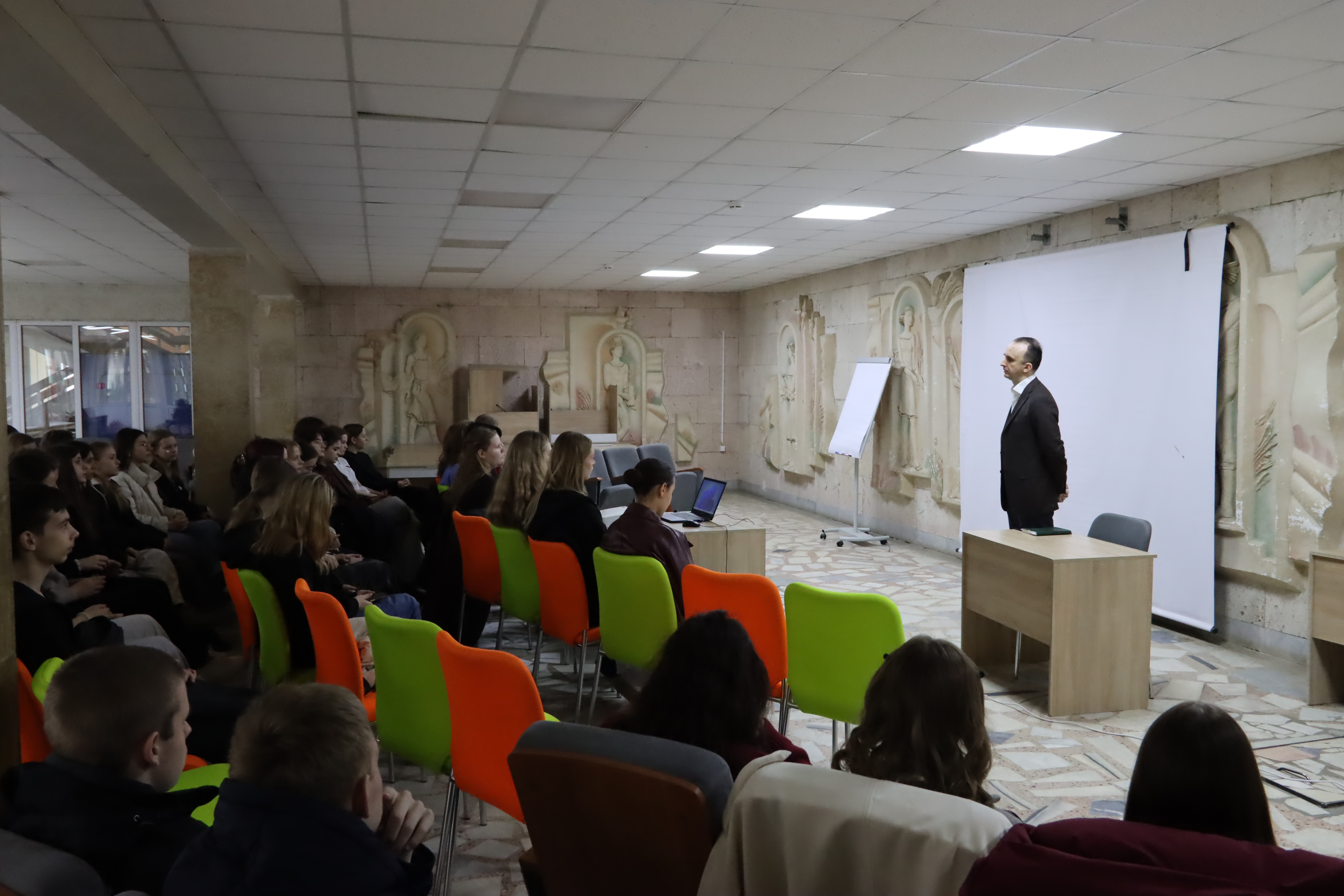 О ценностях и смыслах школьной жизни с будущими педагогами размышлял Миронов Денис Эдуардович, директор калужской гимназии №19.