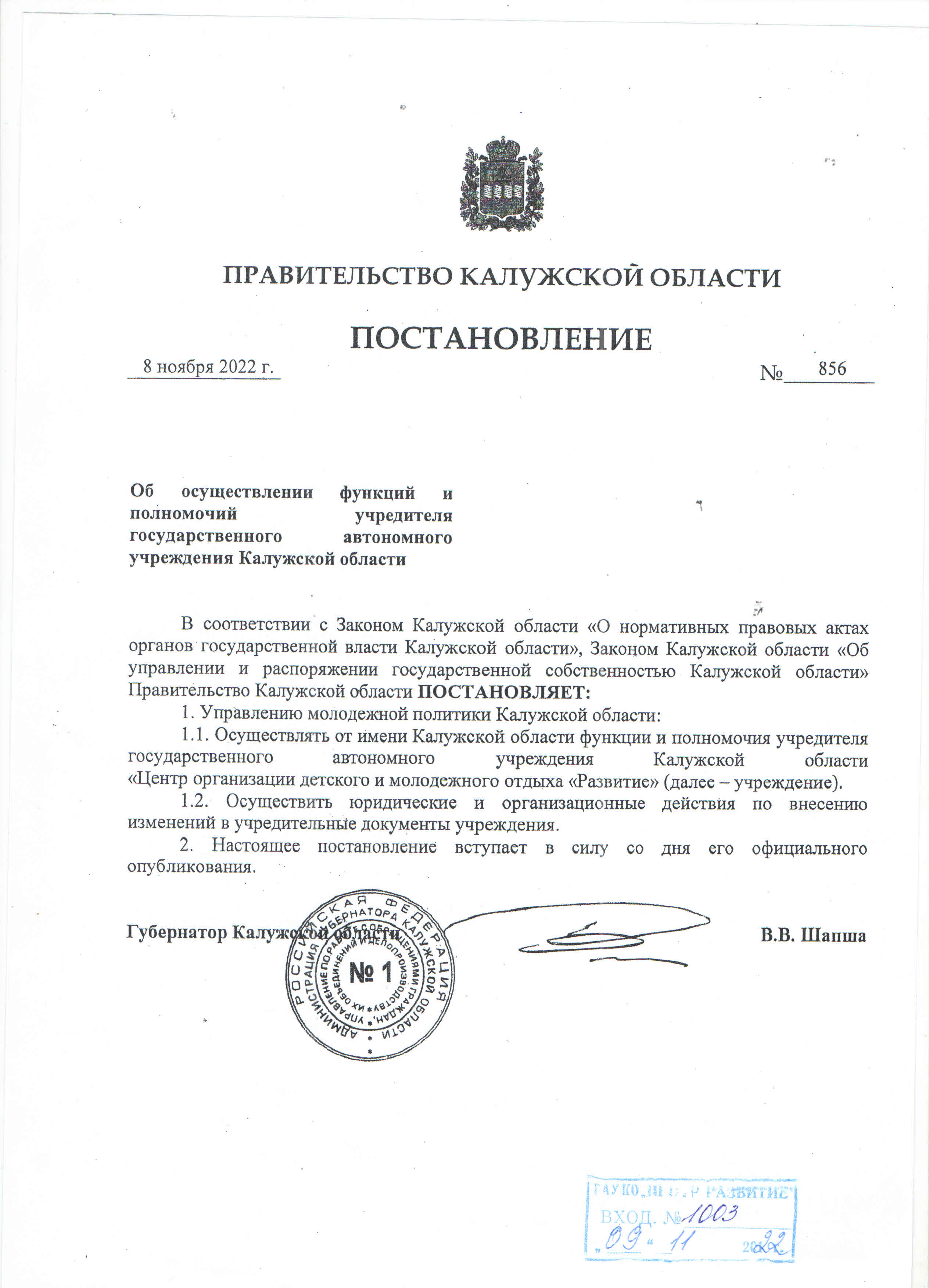 Постановление правительства Калужской области №856 от 8.11.2022
